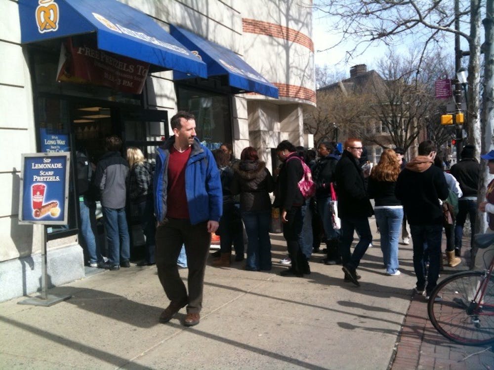 The folks at the Auntie Anne's Pretzel outpost by CVS on Walnut are in a really good mood today. A really good, free regular or cinnamon sugar pretzel day kind of mood! When tipster Paige Rubin inquired as to the occasion, a worker replied, "Oh, just to celebrate! We want everyone to try a fresh, hot Auntie Anne's pretzel!"