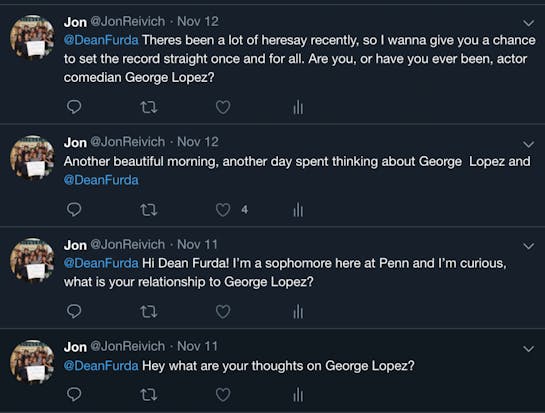 Now, I’m not sure of the specifics yet. Is Dean Furda just a character developed by George Lopez? We know he has the talent for it. Or maybe this is a Dr. Jekyll and Mr. Hyde type situation? We can’t know for sure — the science just isn’t in. Me, I believe that George Lopez is here to protect us. From what? I don't know. But I do know that he is among us, and that makes me feel safe.